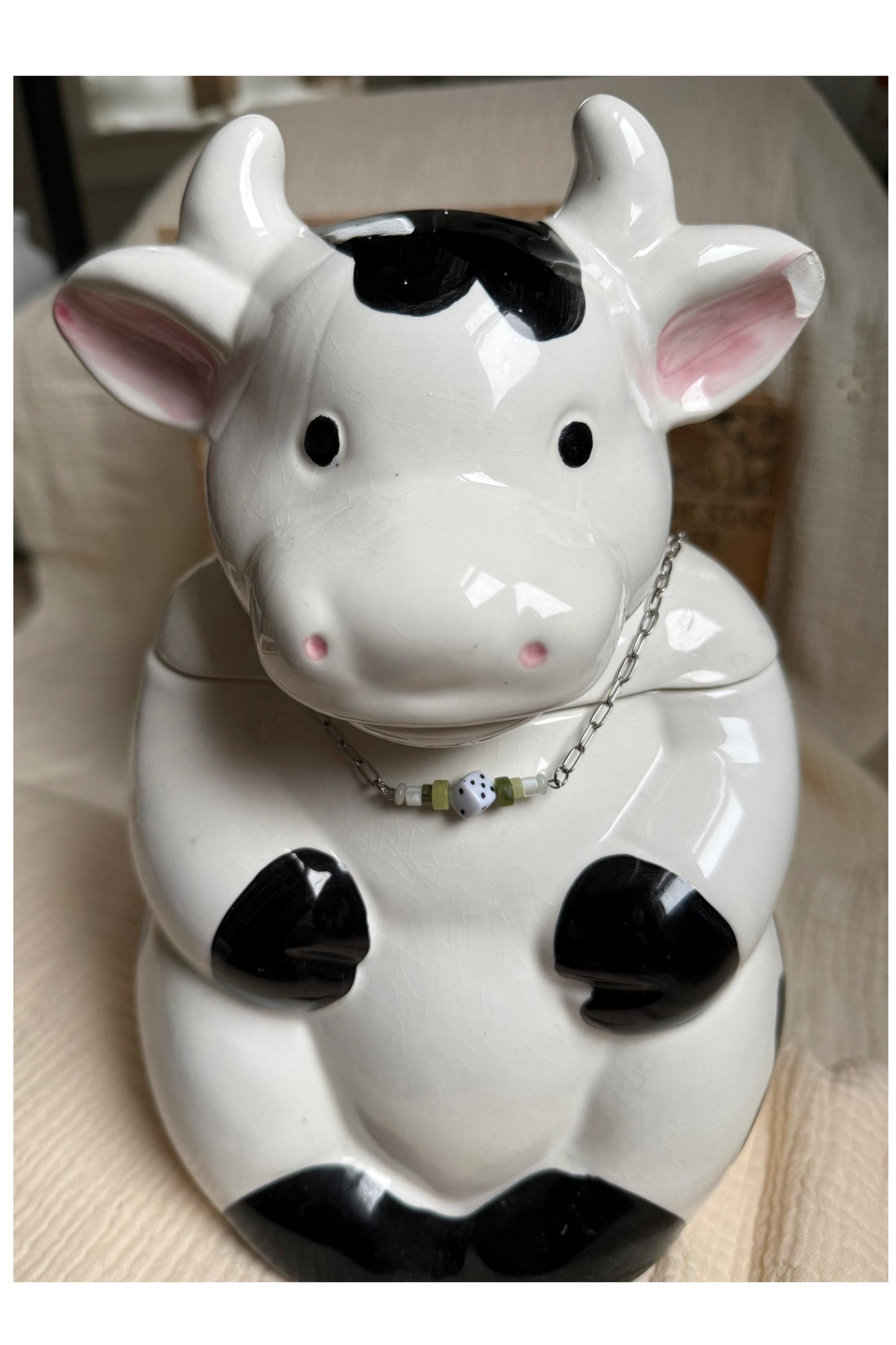 Hardware such as chain and clasp is stainless steel.